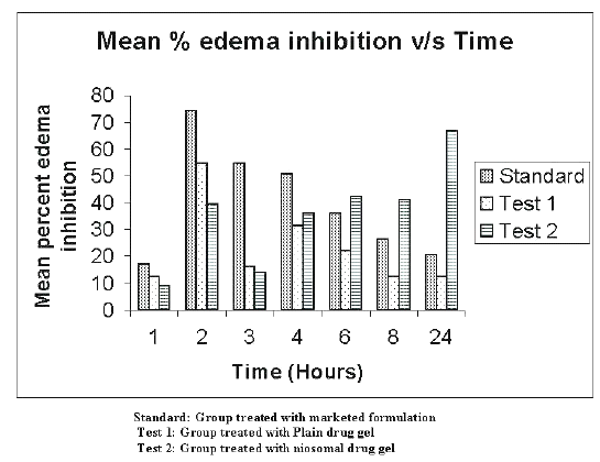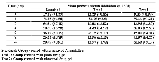 The data were compared by ANOVA technique and differences greater at p< 0.005 were considered significant. Initially (up to 4 hrs), the standard group showed greater percent edema inhibition (C max -74.15%±4.56% at 2 hours) and then the effect reduced significantly with time up to 24 hrs. The group treated with plain drug gel (test group 1) showed maximum percent edema inhibition (C max - 54.75%±2.5% at 2 hours). Percent inhibition then gradually reduced to 12.57%±1.78% in 24 hrs. In case of Niosomal gel i.e. test group 2, percent inhibition was slow almost all test points initially. However, with time up to 24 hrs the percent inhibition gradually increased to 66.68%±5.19%.