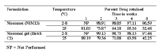 The percent drug retention studies in niosomal suspension (Nim13) and Nim13 incorporated in gel base (Batch C2) were carried out at 2-8°C (refrigerated condition) and 25°C±2°C (room temperature and the results of percent drug retained are recorded Table 3. The results indicate that drug retained above 90% in niosomes for the period of 8 weeks both in niosomal suspension and niosomal gel only at refrigerated condition.