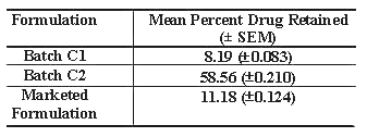 Drug content in the skin was calculated by subtracting the values of drug content in washing medium and in diffusion medium from the initial drug content of the formulation applied and results are recorded in table 6. The diffusion data were subjected to Student's t-test and differences greater at P < 0.005 were considered significant. All the determinations were carried out in triplicates.
