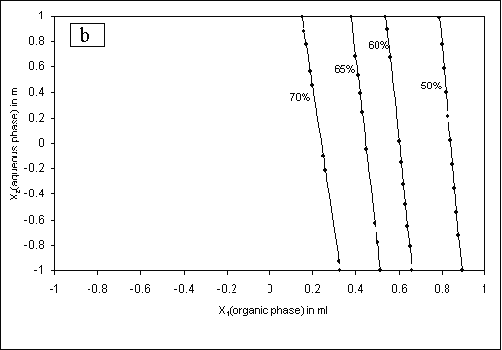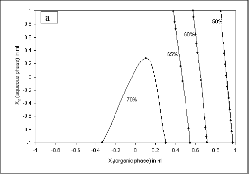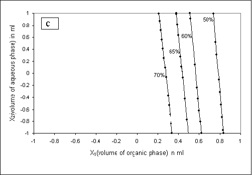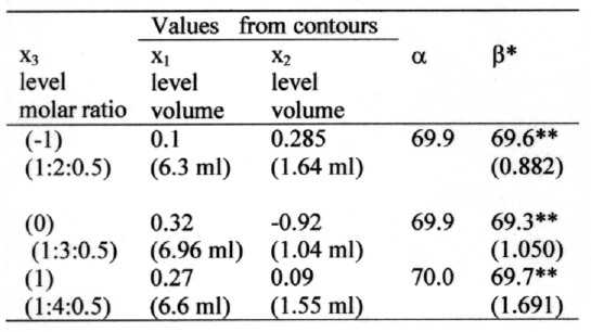 Figure 2b shows the possible contour plots plotted at 0 level of x3 for prefixed PDE values of 50%, 60%, 65% and 70%. All contour plots were found to be linear in nature. The maximum PDE (70%) can be computed with x1 range at 0.148 level (6.44 ml) to 0.326 level (6.98 ml) and the x2 range at -1 level (1.0 ml) to 1 level (2.0 ml). Thus, the range of aqueous to organic phase ratio for better emulsification at 0 level of x3 was computed in the range of 1:3.22 to 1:6.98 for obtaining maximum PDE.