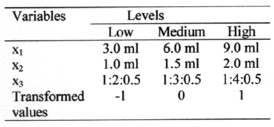 Three independent formulation variables were taken at its three levels; low, medium and high, which were represented by the transformed values of -1, 0, and 1 respectively. Values of these selected variables at different levels are shown in table 1.