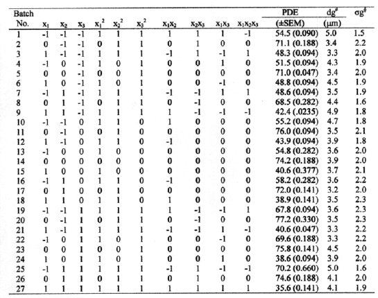 Twenty-seven batches of different combinations were prepared by taking values of selected variables; x1, x2 and x3 at different levels as shown in table 2. The prepared batches were evaluated for PDE; a dependent variable, size and lamellarity. The results are recorded in table 2. Mathematical modeling of the preparation of ACY liposomes by REV method was carried out by using equation 1 to obtain a second order polynomial equation (17).
