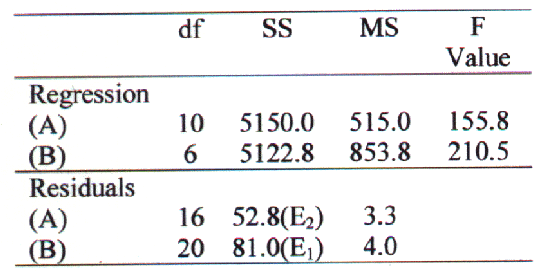 F calculated = [(SSE1-SSE2)/ND/ (SSE2/df Residual) = 7.05/3.3 = 2.14