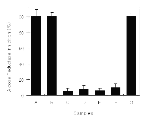 Figure 1: Aldose reductase inhibitory activity of C. cassia bark-derived materials at a concentration of 0.1 mg/mL. A, Methanol extract; B, Hexane fraction; C, Chloroform fraction; D, Ethyl acetate fraction; E, Butanol fraction; F, Water fraction; G, Quercitrin.