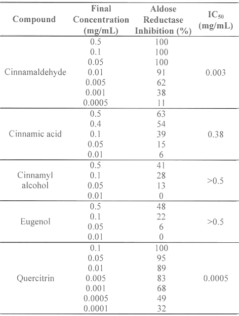 The inhibitory activities of cinnamaldehyde, cinnamic acid, cinnamyl alcohol, and eugenol against aldose reductase were compared to quercitrin, a naturally occurring flavonoid which has been demonstrated to be a potent aldose reductase inhibitor in vitro (Table 1).