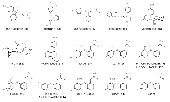 Scheffel et al. (2) give a comprehensive overview of early investigations. Oh et al. (3) and Laakso et al. (4) summarize recent developments. Selective serotonin reuptake inhibitors (SSRIs) such as citalopram (s1), sertraline (s2) and fluoxetine (s3) (Figure 1) have been labeled with carbon-11, but a relatively poor signal-to-noise ratio limited their use in vivo for the quantification of the SERT (2, 5-7). Carbon-11 labeled venlafaxine (s5) also turned out not to be an ideal PET ligand (8). Neither carbon-11 labeling nor fluorine-18 labeling of paroxetine (s4), another SSRI with high affinity for the SERT, has been accomplished yet (2). Many tropane and nortropane analogs have been investigated as PET ligands for the SERT, such as [11C]b-CIT (2-b-carbomethoxy-3-b-(4-iodophenyl)-tropane) (s6) and [11C]nor-b-CIT (2-b-carbomethoxy-3-b-(4-iodophenyl)-nortropane) (9, 10). However, one major drawback is their lack of selectivity for the SERT over the dopamine transporter (DAT). Some new derivatives like ZIENT (2-b-carbomethoxy-3-b-(4-((Z)-2-iodoethenyl)phenyl)-nortropane) (11) and FEINT (2-b-carbomethoxy-3-b-(4-(2-fluoroethyl)-3-iodophenyl)-nortropane) (12) display high specific binding at the SERT and have been proposed as potential PET ligands. The most widely used radiotracer to date for PET imaging of the SERT is [11C](+)McN5652 (trans-1,2,3,5,6,10b-hexahydro-6-[4-(methylthio)phenyl]-pyrrolo[2,1-a]isoquinolone]) (s7) (13, 14), a potent blocker of 5-HT reuptake. McCann et al. (15, 16) could prove neurotoxic effects of MDMA on the serotonergic system in the human brain by using [11C] (+) McN5652 as a radiotracer. However, [11C](+)McN5652 also displays moderate affinity at the norepinephrine transporter (NET) and the DAT; and the low specific to non-specific binding ratio observed with [11C](+)McN5652 in humans limits its application as a PET imaging agent in vivo (14).