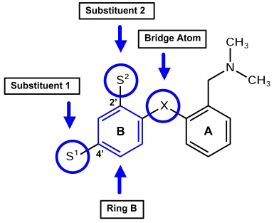 Figure 3: Positions of possible modifications at the diphenyl sulfide scaffold. Substituents in position 2' and 4' were exchanged, as well as the aromatic ring B, and the atom bridging ring A and ring B.