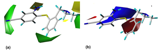 Figure 4: CoMFA steric (a) and electrostatic (b) "StDev*Coeff" plots for the serotonin transporter. The contour levels were derived from examining the field value histograms. Green areas indicate regions where steric bulk favorably effects binding affinity. Yellow regions denote areas in which sterically demanding groups have a detrimental effect on binding affinity. Blue contours enclose areas where partial positive charges increase binding affinity whereas in the regions enclosed by red contours partial negative charges are favored. DASB (s12) is shown within the fields.