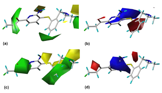 Figure 5: Compound n53 within the steric (a) and electrostatic (b) SERT "StDev*Coeff" CoMFA fields, and within the steric (c) and electrostatic (d) "StDev*Coeff" CoMSIA fields from the selectivity analysis. Green regions denote those areas in which steric bulk is favorable for high binding affinity at the SERT and for high SERT selectivity. Yellow regions denote those areas where steric bulk has a detrimental effect on SERT binding affinity and SERT selectivity. Binding affinity and SERT selectivity is enhanced by partial positive charges in blue regions, and by partial negative charges in red regions.