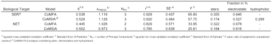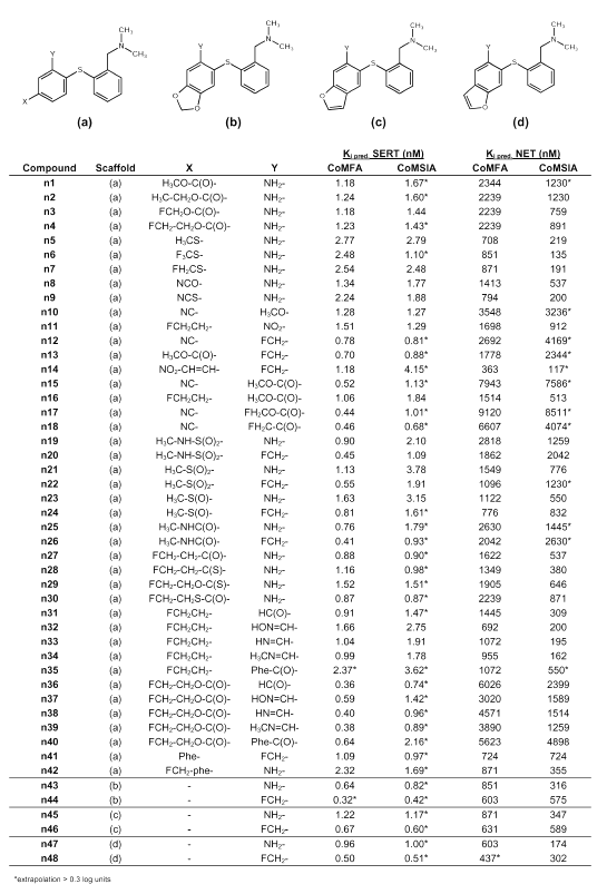 The CoMFA and CoMSIA models established earlier in our group (27) served as starting-point for the virtual development of new substances. They were based on a diverse set of antidepressants (37). For the prediction of the binding affinities at the SERT and at the NET, we used the CoMFA PLS analysis considering sterics and electrostatics, and the CoMSIA PLS analysis considering sterics, electrostatics and hydrophobics (Table 1). These models were chosen as they predict the binding affinity of DASB (s12) both at the SERT and at the NET in the correct order of magnitude (Table 2).
