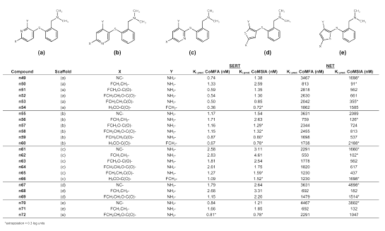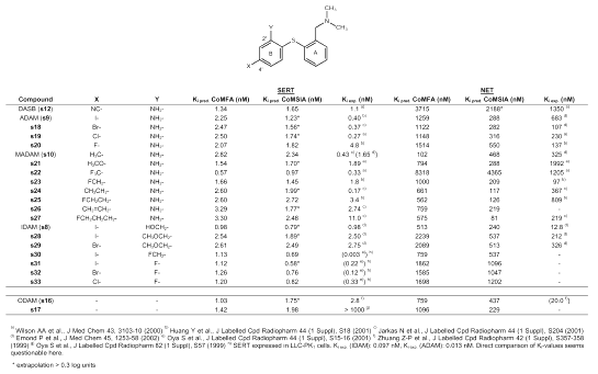 Tables 3 to 5 summarize the molecular structures of the newly designed compounds and their predicted binding affinities at the SERT and at the NET. Very high binding affinity of a radioligand in combination with a comparatively slow clearance from tissue can restrict its usefulness for PET, as the rate-limiting step of tracer retention may become the delivery instead of the binding process (1). A consequence of this would be to only consider substances whose Ki-values are found within a particular range, for instance, between 0.5 and 10 nM as suggested by Lassen et al. (56) for benzodiazepine receptor tracers. However, as the used CoMFA and CoMSIA models cannot predict PET kinetics and thus, no optimum Ki-value for any one compound can be estimated, we did not focus on Ki-values between 0.5 and 10 nM only, but considered substances being estimated as displaying high binding affinity in a nanomolar or subnanomolar range at the SERT and low binding affinity at the NET. Another aspect during molecular design was to obtain structures that could easily be radiolabeled with either carbon-11 or preferably fluorine-18. Carbon-11 labeling of one of the N-methyl groups as seen in [11C]DASB (s12) is not necessarily suitable as the N-methyl groups are susceptible to metabolism. Therefore it seems difficult to quantify radiolabeled metabolites that cross the blood brain barrier and need to be considered during evaluation of a PET study. However, this seems to contrast with recent findings of Halldin et al. (57) who labeled MADAM (s10) with carbon-11 in two different positions (at the methyl group of the phenyl ring, and at one methyl group of the tertiary amino group) and measured metabolism in monkey brain. They found no significant difference with regard to brain kinetics and metabolism, indicating that no radioactive metabolites entered the brain.
