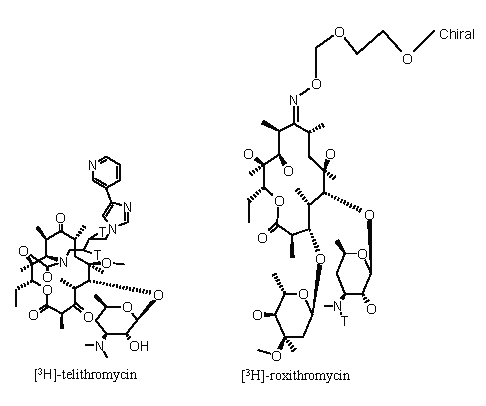 Figure 1: Structure of telithromycin and roxithromycin and location of the 3H-atom (T) in the radiolabelled compounds.
