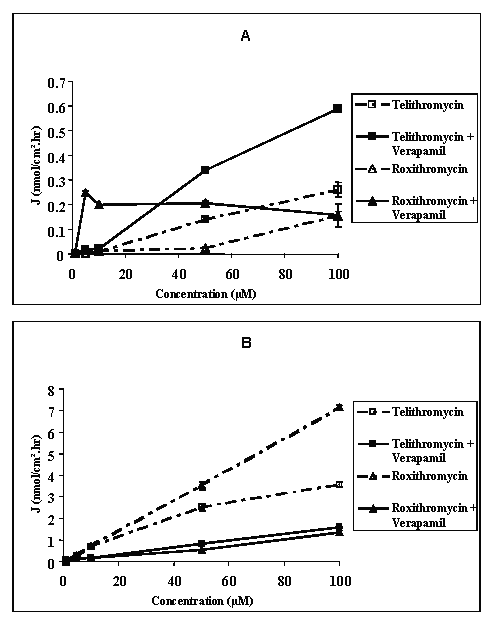 Figure 2: Mean apical to basolateral (A) and basolateral to apical (B) flux values of telithromycin and roxithromycin across Caco-2 cell monolayers as a function of the concentration in the donor medium in the absence or in the presence of 10-4 M of verapamil and in concentration gradient conditions.