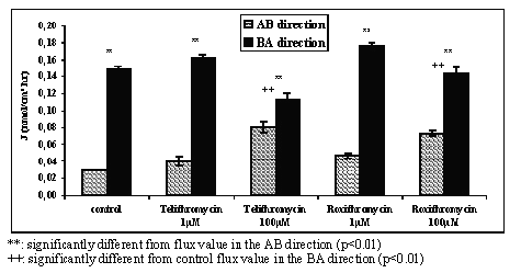 Similar results were obtained for roxithromycin. At 10-6 M the mean flux values were 0.001 ± 0.0001 and 0.040 ± 0.0001 nmol/cm2 .hr respectively in the AB and BA directions while those measured at 4.10-4 M were respectively 81 fold and 27 fold greater (Figure 5). The mean Papp value in the AB direction increased from 3.2 10-7 ± 0.1 10-7 cm/s at 10-6 M to 5.6 10-7 ± 0.3 10-7 cm/s at 4.10-5 M, while the Papp value in the BA direction decreased from 119.3 10-7 ± 3.7 10-7 at 10-6 M to 75.9 10-7 ± 3.1 1-7 cm/s at 4.10-5 M (Table 2).