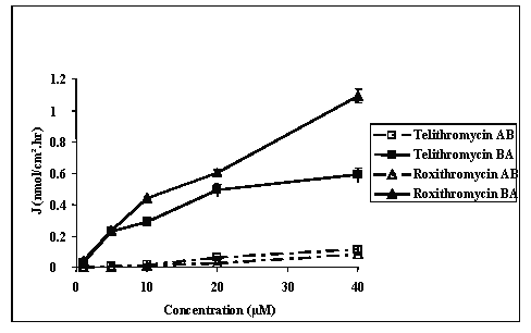 Under these conditions, transport studies with telithromycin and roxithromycin at concentrations ranging from 10-6 M to 4.10-5 M indicated that the absorptive and secretive fluxes were not linearly correlated with the donor concentration and that transport in the BA direction was considerably greater than that observed in the AB direction (Figure 5).