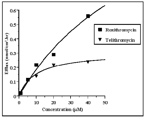 Plots of active efflux versus concentration of the compounds are shown in Figure 6. The best fit plots indicated that Km values were 45.4 and 9.8 mM respectively for roxithromycin and telithromycin and that Vm values were 1.1 and 0.3 nmol/ cm 2 .hr respectively.