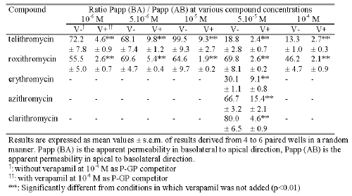 Transport studies in the AB and BA directions were performed with telithromycin, roxithromycin, erythromycin, azithromycin, clarithromycin and verapamil.