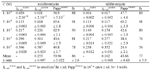 Table 2: Passive flux, active efflux, passive permeability and extrapolated maximal absorption in humans of telithromycin and roxithromycin calculated in transport studies across Caco-2 monolayers in concentration equilibrium conditions.