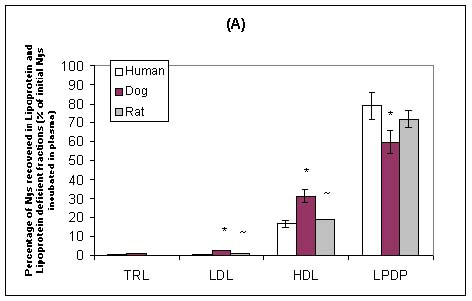 Our laboratory has recently investigated the plasma distribution of free and liposomal Nys within human, dog and rat plasma.102 When free and liposomal Nys were incubated in human, dog or rat plasma, the majority of the drug was recovered in the lipoprotein-deficient plasma fraction (which primarily contains albumin and a-1-glycoprotein) (Figure 5). However, a significantly greater percentage of Nys was recovered in the lipoprotein fraction (primarily HDL) following the incubation of liposomal Nys than following the incubation of free Nys (Figure 5). There was a significant correlation between the lipoprotein lipid and protein profiles in human, dog and rat plasmas and the distribution of free Nys and liposomal Nys in plasma. Specifically, differences in the proportion of plasma lipoprotein cholesterol, triglyceride and apolar lipids (cholesteryl esters and triglycerides) carried by HDL influenced the distribution of free Nys and liposomal Nys within plasmas of different species. In a further study, we reported that as the amount of HDL protein decreased the amounts of free Nys and liposomal Nys recovered within this fraction decreased.103 Taken together these finding suggest that the distribution of Nys among plasma lipoproteins maybe defined by the proportion of lipid and protein carried by HDL, and may be an important consideration when evaluating the pharmacokinetics, toxicities and activities of these compounds following systemic administration to different animal species.