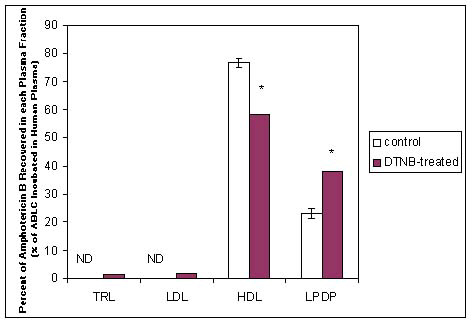Figure 2: Distribution of Amphotericin B Lipid Complex (ABLC) (20μg of AmB/ml of plasma) following incubation within human plasma that has been treated with DTNBa (15mM). ABLC was incubated in plasma pretreated with DTNBa 18 hours prior to the experiment or in untreated plasma (control) for 60 min at 37oC. Following incubation the plasma was separated into its triglyceride-rich lipoprotein (TRL), low-density lipoprotein (LDL), high-density lipoprotein (HDL), and lipoprotein-deficient plasma (LPDP) fractions by ultracentrifugation and assayed for AmB by HPLC; n = 3; data are expressed as mean ± standard deviation. * P < 0.05 vs. control.