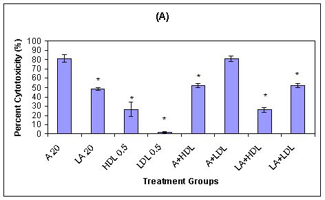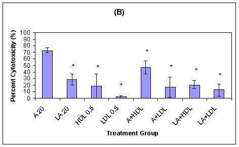 Figure 3: (A) Influence of serum Lipoprotein-associated AmB and L-AmB on drug toxicity to LLC PK1 renal cells as percent cytotoxicity of LLC PK1 cells in serum-free medium at 37oC containing the following treatments: AmB (20 mg/ml) (A 20), L-AmB (20 mg/ml) (LA 20), HDLs (0.5mg of protein per ml; HDL 0.5), LDLs (0.5 mg of protein per ml; LDL 0.5), mixtures of AmB (20 mg/ml) with HDLs (A+HDL) or LDLs (A+LDL), and mixtures of L-AmB (20 mg/ml) with HDLs (LA+HDL) or LDLs (LA+LDL) (n = 3; values are means ± standard deviations). * P < 0.05 versus treatment with AmB at 20 mg/ml.