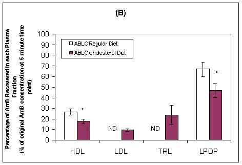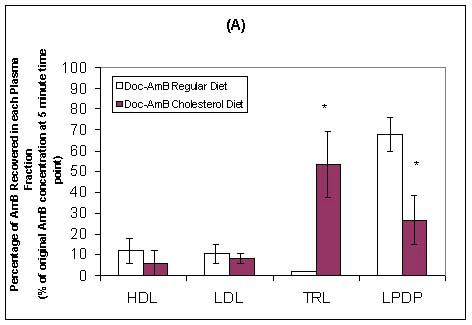 Figure 4: In vivo distribution in plasma at 5 minutes following the administration of the last intravenous dose of Doc-AmB (A) or ABLC (B) to cholesterol-fed or regular diet-fed rabbits. Values are means ± standard deviations (n = 5), * P < 0.05 versus rabbits fed a regular diet and receiving Doc-AmB or ABLC. The LPDP fraction includes albumin and α-1-glycoprotein.