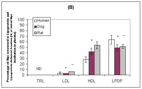 Figure 5: Distribution of free Nys (A) and liposomal Nys (B) (20mg/ml) in human, dog, and rat plasma following incubation for 5 minutes at 37oC. The data are expressed as percent of total Nys distributed in TRL, LDL, HDL, and LPDP fractions. The data are reported as means ± standard deviations (n = 3). * P < 0.05 compared to human plasma; ~ P < 0.05 compared to dog plasma.