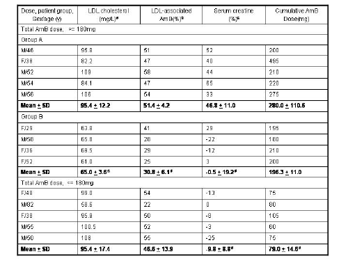 Table 1: The serum low-density lipoprotein (LDL) cholesterol concentration, amount of AmB associated with plasma LDL, serum creatinine concentrations, and cumulative AmB dose following 10 days of therapy administered to patients with an anticipated or confirmed fungal infection.
