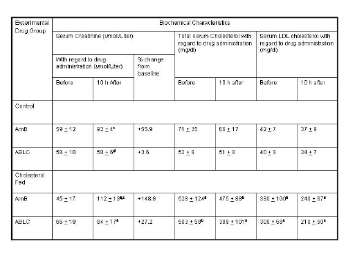 Amphotericin B lipid complex or amphotericin B multiple-dose administration to rabbits with elevated plasma cholesterol levels: pharmacokinetics in plasma and blood, plasma lipoprotein levels, distribution in tissues, and renal toxicities, Antimicrob. Agents Chemother. 45, 1184-91 (2001) M. Ramaswamy, K. D. Peteherych, A. L. Kennedy and K. M. Wasan,