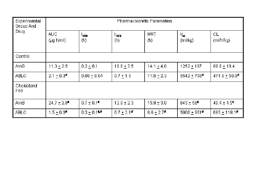 Table 2: Biochemical Characteristics of serum and pharmacokinetic parameters of drug after a single intravenous dose of AmB and ABLC (1mg/kg) in control and cholesterol-fed (0.05% w/v cholesterol) rabbits.a