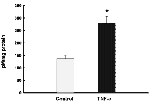 Figure 3: Determination of nitrite in Hepa 1c1c7 cells with fluorometric HPLC method. Cells were treated with TNF- a (10 ng/ml) in HBSS for 10 hrs prior to assay. Data are expressed as mean ± SD (n = 6), *p<0.05 compared to control.