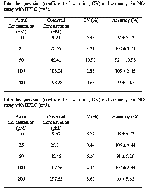 The sensitivity of this HPLC method for NO2¯ analysis is greater than that of the batch fluorometric method (detection limit, 10-20 mM), the Griess colorimetric assay (detection limit 0.1 - 1 mM) (8, 9), and the HPLC methods with UV-VIS or conductimetric detection (detection limit, 0.1-0.5 mM) (14, 28). Moreover, we found that the samples were prepared by our method could be used directly for NO2¯ analysis by the HPLC method without prior filtration. With this method, we are also able to eliminate the high background absorbance caused by the contents of DMEM cell culture medium.