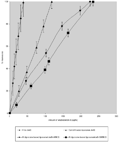 The extent of haemolysis is an important parameter of toxicity of AmB to erythrocytes (Mehta et.al. 1989, Forster et.al 1998), while evaluating different liposomal AmB preparations. In brief, blood samples were drawn from Balb/c mice in the presence of heparin (50-units/ ml) and washed 3 times with 0.15M PBS (pH 7.4). A series of free AmB samples were prepared for haemolysis experiment by further diluting stock solution of AmB in PBS (pH 7.4) to get varying concentration ranged 0 - 50 mg AmB / ml, whereas dose levels of AmB used in the in-vitro analysis assay was ranged from 0 - 250 mg AmB /ml for PBLV. Subsequently, 0.8 ml of 0.1% red blood cells (vol. /vol.) were mixed with 0.2ml of buffer containing varying amounts of free AmB and proliposome-based liposomal vesicle (PBLV) entrapped inclusion complex. The dose levels of AmB used in the in-vitro haemolysis assay was ranged from 0 to 250 mg AmB/ml. The mixture was then incubated at 37°C for 1 hr and centrifuged at 1000xg for 2 min. The amount of haemoglobin released in the presence of 0.3% Triton X-100 was taken as measure of complete (100%) lysis.