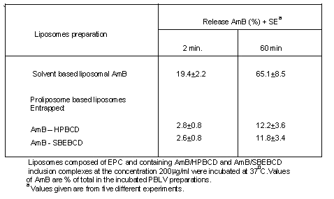 Previous work (Chakraborty & Naik, 1998) has already established the optimal conditions (in terms of structural organization of proliposome mixtures) for the entrapment of inclusion complexes (AmB-bCD) into vesicles and its stabilization in-vitro. Furthermore, we have also observed earlier that the inclusion complex (AmB - SBEBCD) protects the drug more efficiently against destructive interaction with the serum lipoproteins and cell membrane, in the cavity of this modified β-cyclodextrin (Chakraborty and Naik, 2001).