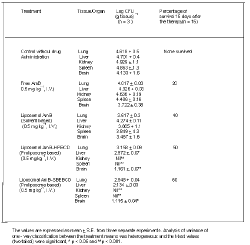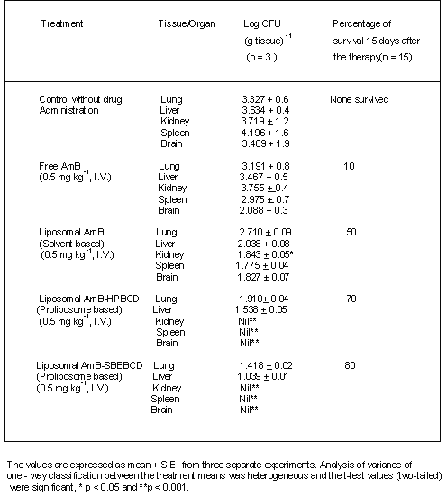 In the present investigation of antifungal activity (in-vivo) of amphotericin B, no significant differences were observed between the liposomal formulations of entrapped AmB-HPBCD and AmB-SBEBCD in the mouse models of aspergillosis and cryptococcosis. Our observations are in complete agreement with the earlier reports (Moonish et. al., 1993, Ahmad, et. al., 1989). In addition our observations also suggest the possibility of PBLV comprised inclusion complex (AmB - HPBCD / SBEBCD) behaving as a depot from which the free AmB is released slowly to the site of infection, which may be due to mechanical trapping of liposomes in the damaged alveolar capillaries (Moonish et al., 1993) and delivery of phagocytosed liposomes containing AmB to the infected site via circulating monocytes and/or macrophages. In addition, proliposome based liposomal AmB markedly slow down the rate of transfer of the amphotericinB from the vesicles to erythrocytes & other tissues and its subsequent removal from plasma, resulting in higher in-vivo stability, residence time and intrinsic permeability of drug - sterol complex (Chakraborty & Naik, 2001). Obviously, this specific physiological event might help to achieve a significant improvement in the therapeutic index of PBLV.