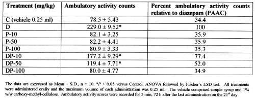 The percent ambulatory activity counts (PAAC) after cessation of BZF-treatments, being statistically similar to the PAAC of the control group mice, further confirm that there are no physical symptoms of aggression or relapse of anxiety on 25th day, after the treatment with BZF for 21 days. Co-treatments of diazepam (20 mg/kg) concomitantly with the three doses of BZF for 21 days, also attenuate the development of diazepam dependence, in a dose-dependent-manner. The co-treatment of diazepam (20 mg/kg) with 100 mg/kg of BZF (DP-100) affords the complete suppression of the withdrawal-induced-anxiety, as the PAAC after this co-treatment (34.9) is statistically equivalent to that of the PAAC exhibited by the control group (34.4) of animals on the 25th day. The PAAC of the other co-treatments, i.e., DP-50 (20 mg/kg diazepam + 50 mg/kg BZF) and DP-10 (20 mg/kg diazepam + 10 mg/kg BZF) being 52.0 and 77.4 respectively.