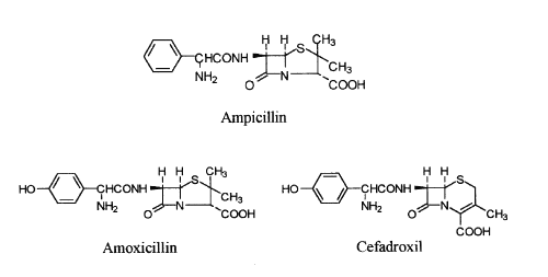 Figure 1: Structures of ampicillin, amoxicillin and cefadroxil (internal standard).