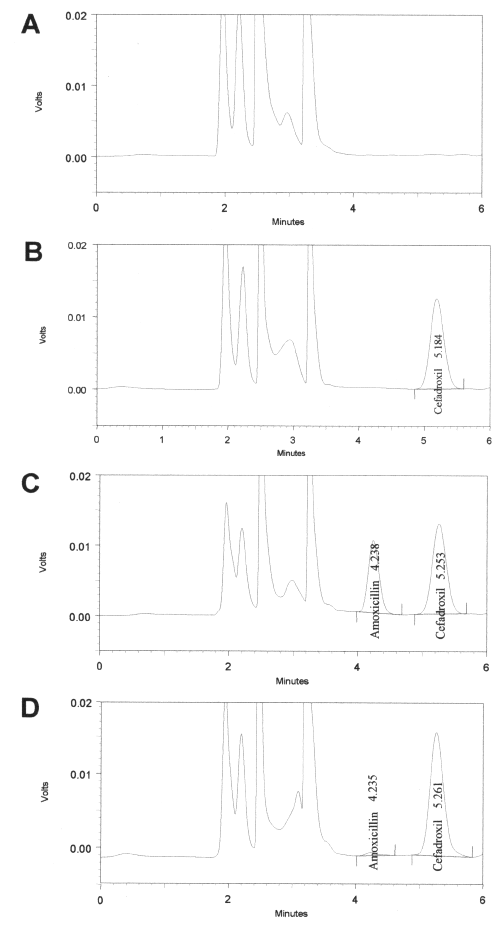 Figure 2: Chromatographic analysis of amoxicillin A) plasma blank; B) plasma + internal standard (cefadroxil 15mg/ml); C) plasma + amoxicillin (20mg/ml) + internal standard (cefadroxil 15mg/ml); D) Chromatogram obtained from plasma of a volunteer following oral administration of Amoxicillin (500mg).