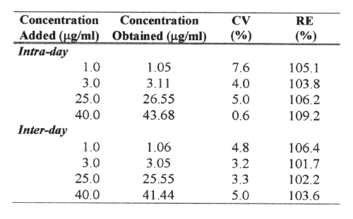 The analytical precision and accuracy obtained for intra-day and inter-day assays of four quality controls (1, 3, 25 and 50mg/ml; n=5) are shown in Table 1.