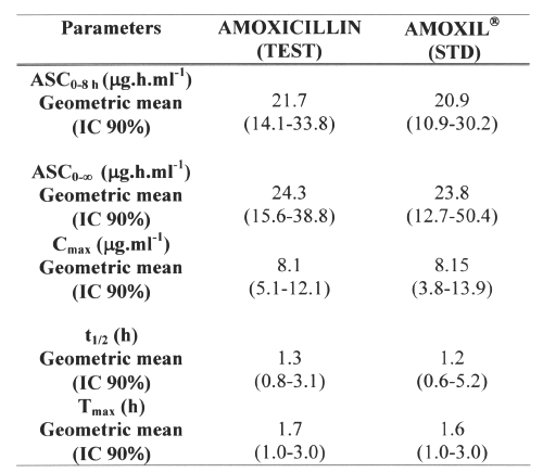 The validated HPLC method employed here proved to be simple, fast, reliable, selective and sensitive enough to be used in clinical pharmacokinetic studies of AMO in humans. The median Tmax and Cmax values for both oral formulations were similar to those reported in the literature. The present study shows that Amoxicilina 500mg capsules was bioequivalent to Amoxil® capsules 500mg, in terms of both the rate and extent of absorption, as assessed by the appearance of 90% CI for both AUC0-8h and Cmax ratios within the 80-125% interval proposed by the Food and Drug Administration .