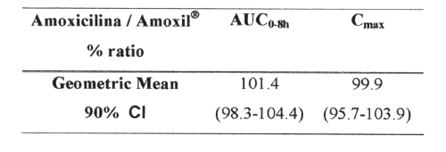 Table 3: Statistical analysis of AUC 0-8h and C max ratios between Amoxicilina (Test) and Amoxil® (Standard).
