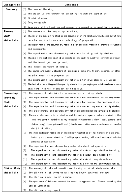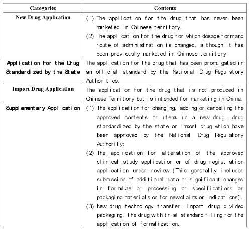 An applicant in Chinese territory can register a new drug application, an application for the drug standardized by the state, and a supplementary application. An import drug application and supplementary application are appropriate to the applicant beyond Chinese territory.