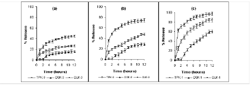 The effect of polymer content on drug-release as a function of time was found to be significantly different (P <0.0001, single factor ANOVA) for a specific set of drug and polymer irrespective of their chemical nature. Comparing the corresponding release profile for a particular drug and polymer system from Figure 1-3, it can be observed that, for all the drugs under investigation, drug release is inversely proportional to the level of rate retarding polymer present in the matrix system, i.e. the rate and extent of drug release increases with decrease in total polymeric content of the matrix. It is observed that, for kollidon SR matrix system, 26%, 48% and 85% of theophylline was released from formulation TPK-3, TPK-2 and TPK-1 containing 75, 50 and 25 % of polymer. On the other hand 16%, 29% and 60% of diclofenac sodium and 45 %, 74 % and 97 % of diltiazem HCl was released from formulations containing 75, 50 and 25 % of kollidon SR respectively. Although the release rates were different, similar trend was found when Carnauba wax and HPMC-15 cps were used as the matrix-forming polymer. A linear relationship exist between the polymer content and rate of drug release irrespective of physico-chemical nature of drug and polymer as characterized by higher values of correlation-coefficient (r2 > 0.98) illustrated in Figure 4a-c.