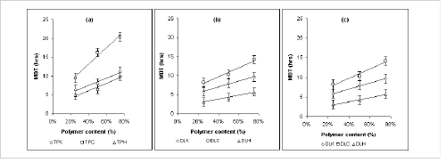 MDT value is used to characterize the drug release rate from the dosage form and the retarding efficacy of the polymer. A higher value of MDT indicates a higher drug retarding ability of the polymer and vice-versa. The MDT value was also found to be a function of polymer loading, polymer nature and physico-chemical property of the drug molecule. Figure 5(a-c) shows that a direct relationship can be found with MDT value and polymer loading irrespective of drug and polymer type which is linear in nature (r2>0.98).