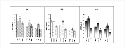 From all the polymers, the MDT of soluble drugs (Diltiazem HCl and Theophyllline) were significantly lower than those of less soluble drugs (e.g. Diclofenac sodium) as illustrated in Figure 6 (a-c).