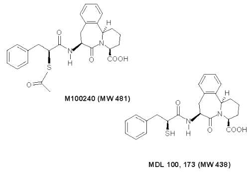 Several in vitro methods are available to assess the oral absorption potential of new molecular entities, such as immobilized artificial membrane chromatography and cell culture models of intestinal permeability such as Caco-2 monolayers.[4] However, some agents are not stable in these systems, prompting the need for alternative methods of permeability testing. In this case, M100240 was unstable and rapidly hydrolyzed to MDL100, 173 in Caco-2 system. As a result, one alternative is the parallel artificial membrane permeability assay (PAMPA).[5] We report here the use of PAMPA to assess the permeation of M100240 -- an acetate thioester of MDL 100,173 -- a dual angiotensin-converting enzyme (ACE)/neutral endopeptidase (NEP) inhibitor[6] currently in development for cardiovascular conditions (Figure 1).