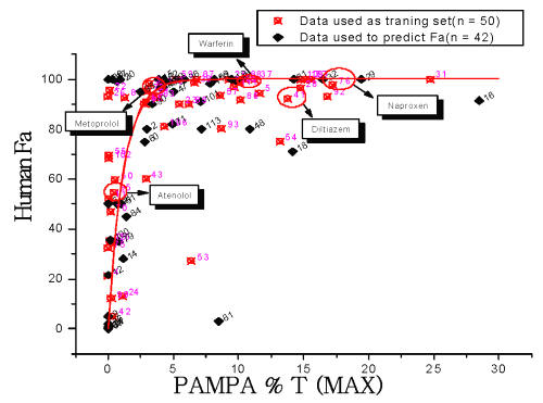 The prediction model of human fraction absorption (Fa) showed in Figure 2 used 50 commercial drugs as a training set (red open circles). Figure 2 shows a hyperbolic curve created by the equation discussed in the method. Another 42 commercial compounds (black diamonds) were used to confirm the accuracy of the equation. The human Fa of these 42 commercial compounds was projected by their PAMPA percentage transport and compared with literature human Fa shown in Figure 3. There is a good correlation (R=0.68) between calculated human Fa and literature human Fa with few outliers. Among them. L-Phenylalanie (66) is transported by active transporter. Paromomycin (81) is a substrate for P-glycoprotein. PAMPA only estimates the ability of molecules to permeate membranes by transcellular passive diffusion. Thus, PAMPA is not suitable for these two compounds. The correlation coefficient is 0.83 without these two compounds. Compound 6 (Amiloid), 12 (Bretylium tosylate, 21 (Ceftriaxone) all have very low human fraction absorbed. Their PAMPA percentage transports are less than 0.1 %. Therefore, PAMPA may not be sensitive enough to predict the absolute human Fa. It is accurate enough to rank compound permeability, which is solely transported by transcellular passive diffusion. For some compounds transported across membrane partly by transporter and/or paracellular routes, PAMPA may underestimate its permeation value.