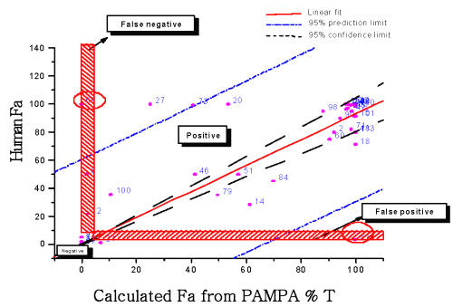 Figure 3: The calculated human fraction absorbed of 42 commercial compounds from their PAMPA transport value was plotted against their literature data. The red line is linear fit. Dash dot line is 95% prediction limit. The dash line is 95% confidence limit. The horizontal hatched box is the false positives and vertical box is false negative. The area above two hatched boxes is positive and below is negative.