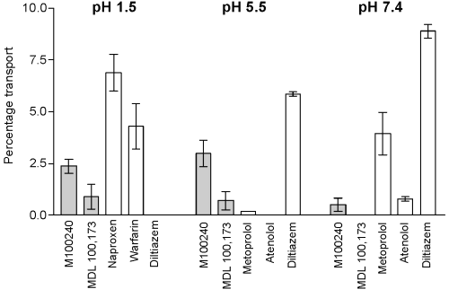 MDL 100,173 showed low permeation at both pH 1.5 and 5.5 (Figure 4), the latter corresponding to a medium-to-low predicted Fa in humans.