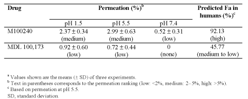 Table 3: Percentage transport of M100240 and MDL 100,173 in the parallel artificial membrane permeability assaya and predicted fraction absorption (Fa) in humans.